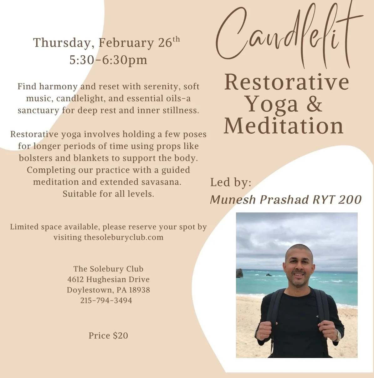Restorative yoga involves holding a few poses for longer periods of time using props like bolsters and blankets to support the body. You'll be guided through deep breathing and mindfulness to bring you back to the present moment while surrounded by soft music, candle light and a peaceful atmosphere.