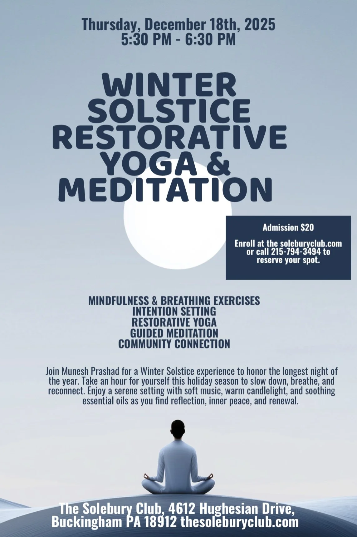 Join Munesh Prashad for a Winter Solstice experience to honor the longest night of the year. Take an hour for yourself this holiday season to slow down, breathe, and reconnect. Enjoy a serene setting with soft music, warm candlelight, and soothing essential oils as you find reflection, inner peace, and renewal